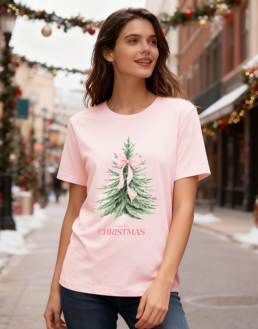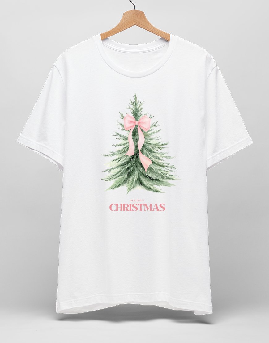 Soft, sweet, and perfectly festive tee features a watercolor Christmas tree wrapped in a dreamy pink bow, with “Merry Christmas” written below. It’s holiday charm with a feminine twist.